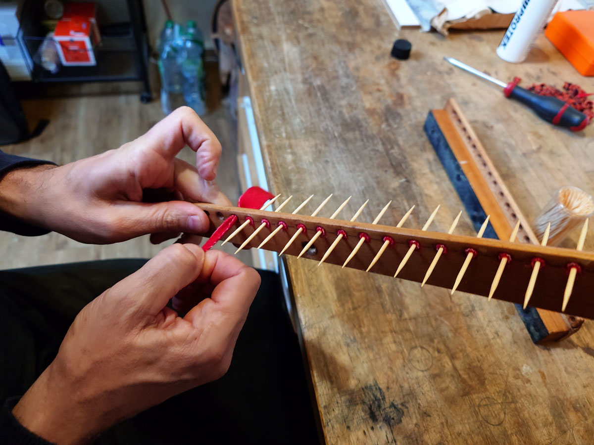La préparation de la mécanique touche à sa fin ; les nouvelles têtes de marteaux sont préparées, avant collage. Elles ont été percées et affinées, avant le montage.